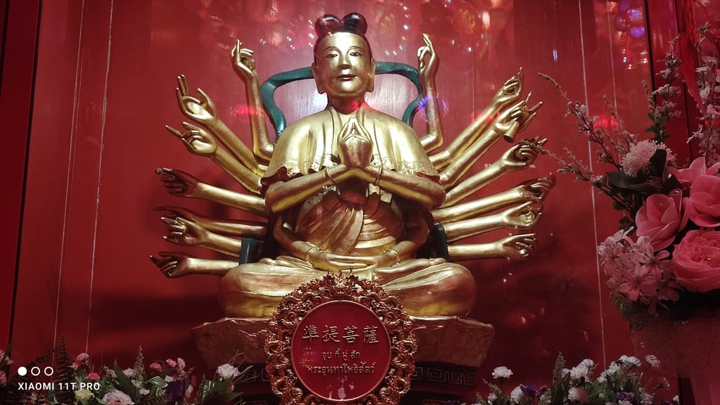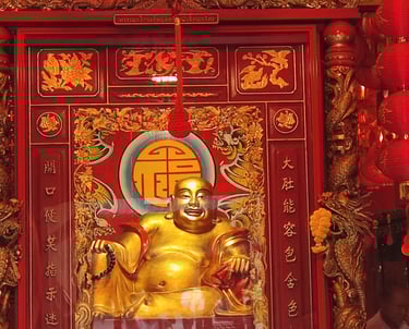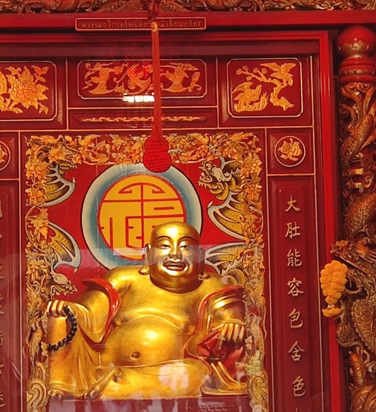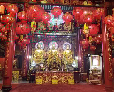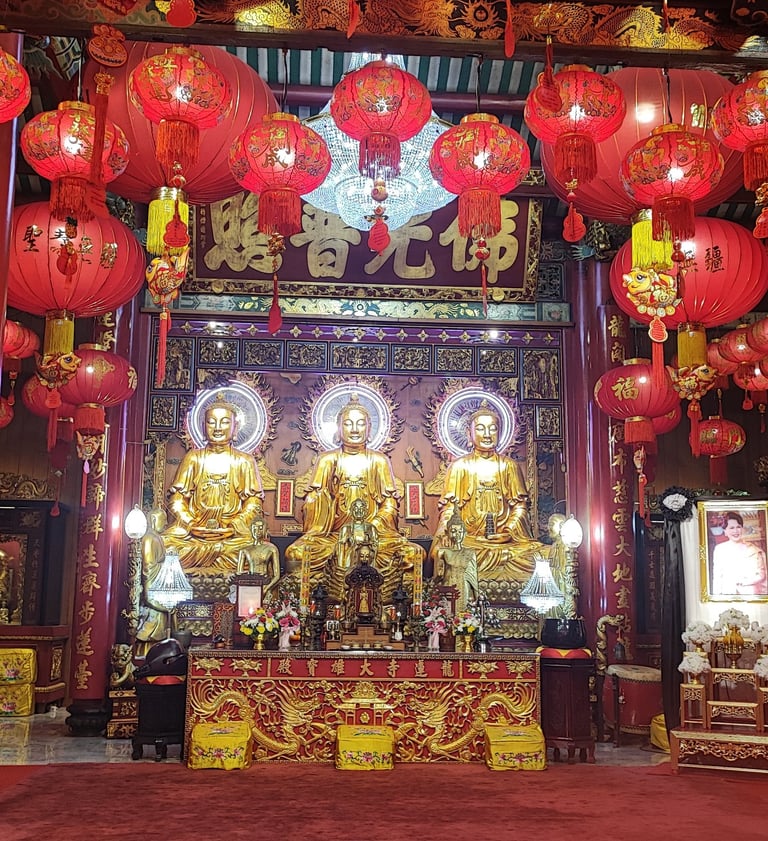 พระศรีศากยมุนีพระพุทธเจ้า , พระอมิตาภพุทธเจ้า และ พระไภษัชยคุรุไวฑูรยประภาตถาคต (พระประธานภายในพระอุโบสถ ณ วัดมังกรกมลาวาส หรือ วัดเล่งเน่ยยี่)