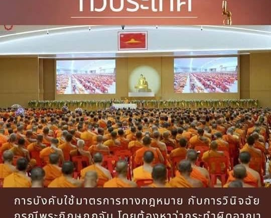ประเด็น :- การบังคับใช้มาตรการทางกฎหมาย กับ การวินิจฉัย กรณีพระภิกษุถูกจับ โดยต้องหาว่า กระทำผิดอาญา บนฐานพระวินัยบัญญัติ