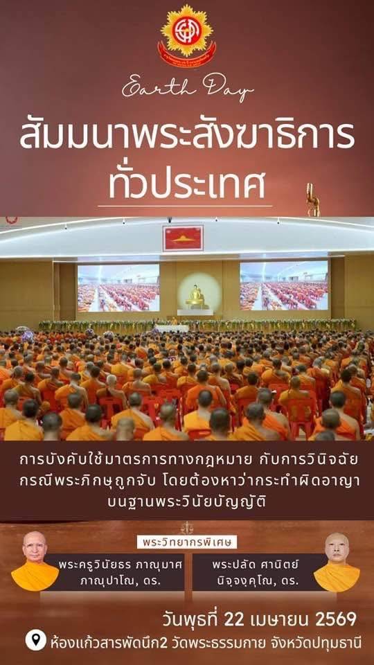 ในวันที่ 22 เมษายน พ.ศ. 2569 ที่ห้องแก้วสารพัดนึก2 วัดพระธรรมกาย จ.ปทุมธานี จะมีการสัมมนาในหัวข้อ "การบังคับใช้มาตรการทางกฎหมายกับการวินิจฉัยกรณีพระภิกษุถูกจับ" ซึ่งจุดประสงค์หลักของการสัมมนานี้คือการศึกษาและถกเถียงเกี่ยวกับกระบวนการที่เกิดขึ้นเมื่อพระภิกษุถูกจับกุมภายใต้ฐานความผิดทางอาญา ในขณะเดียวกันต้องพิจารณาถึงพระวินัยที่กำหนดไว้ด้วย